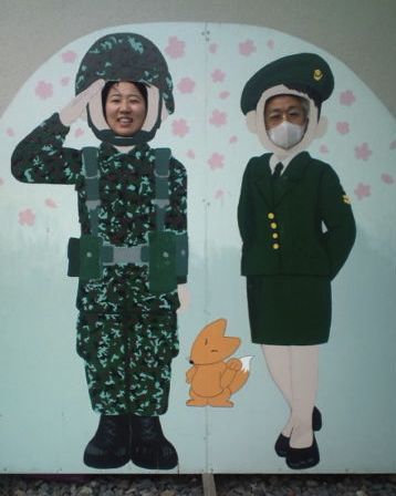 商工会議所の見学会と言えば"お約束"の記念撮影。今回はイノシシの代わりでなくて、自衛官。