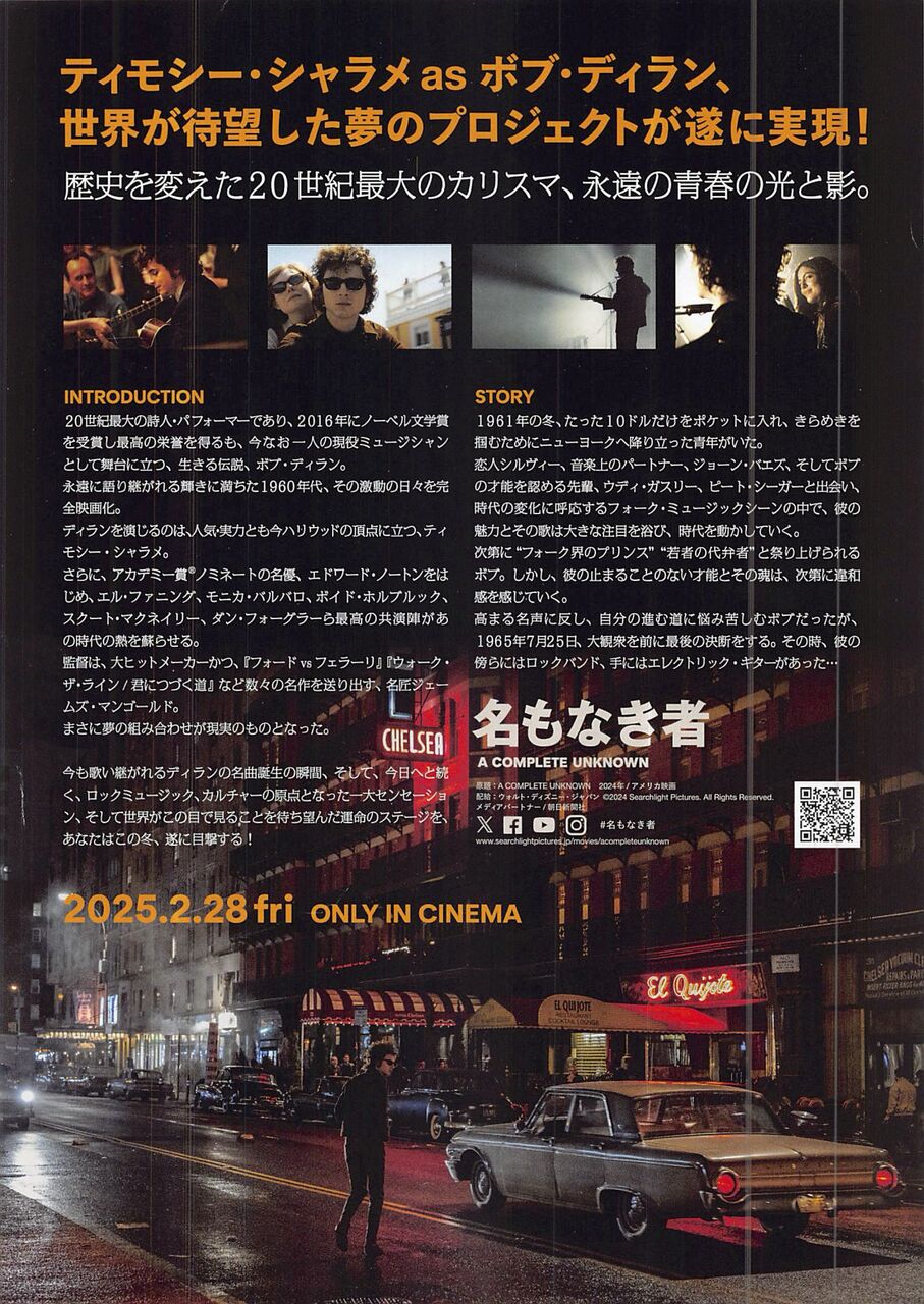 それから、この映画のタイトル「A Complete Unknown」は、前出の曲「Like A Rolling Stone」の歌詞の一節なんだけど、タイトルの付け方もいいね。