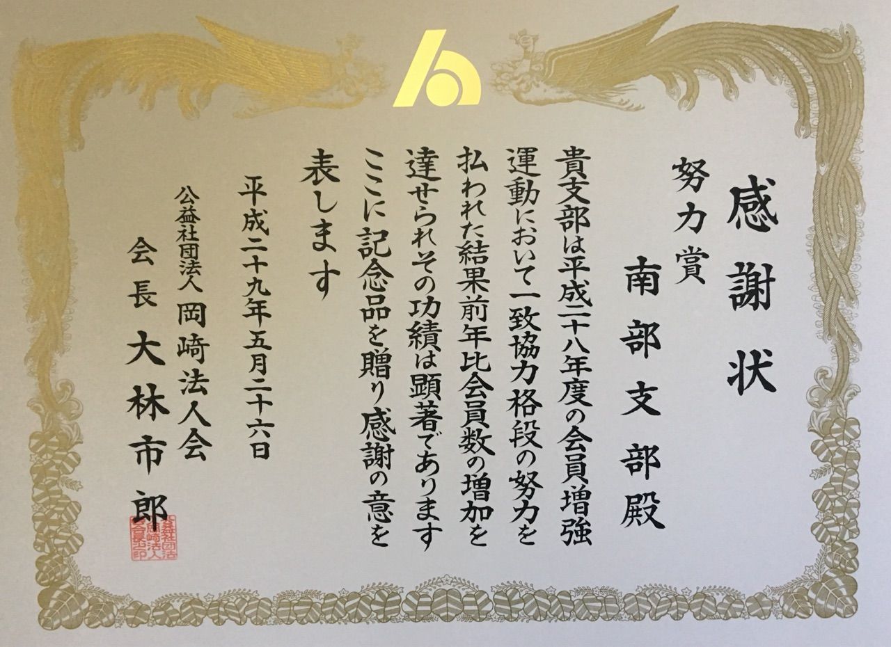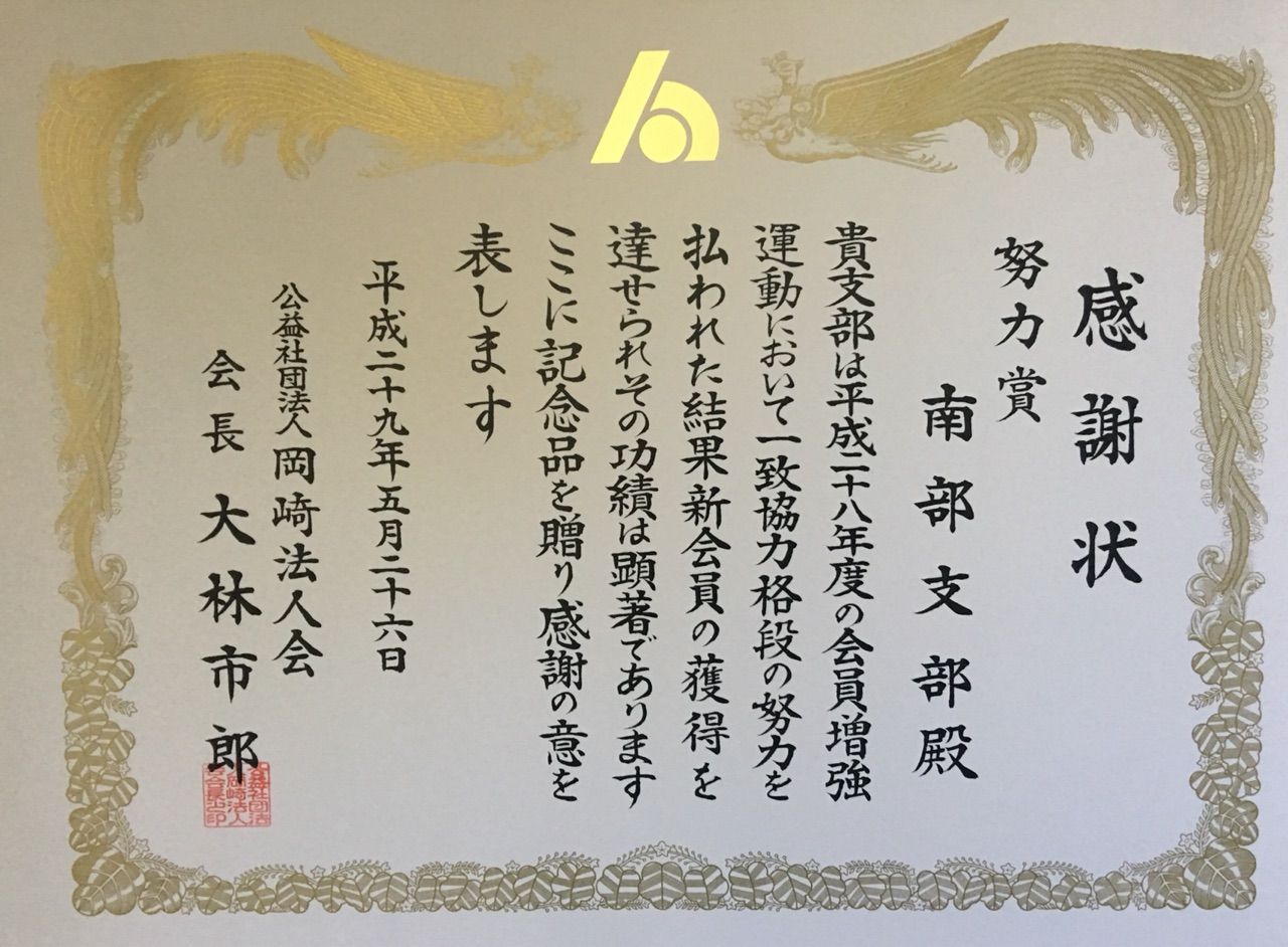 南部支部は、会員増強の功績により感謝状をいただいた。