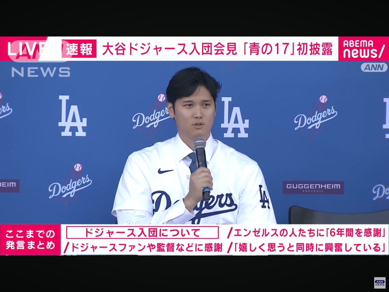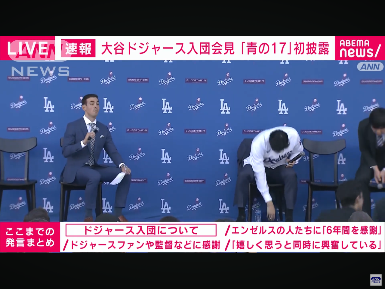 「みなさん、本日はお集まりいただきありがとうございます。まず最初にこのような機会をいただき、今回、選手としての自分を信じてくださったロサンゼルス・ドジャースのチームのみなさん、特にマーク・ウォルター(オーナー)、アンドリュー・フリードマン(編成本部長)、スタン・カステン(球団社長兼CEO)、ブランドン・ゴームス(GM)、デーブ・ロバーツ(監督)。この5人には本当に感謝しています。ありがとうございます。そして私にメジャーリーガーとしての最初のチャンスを与えてくださったエンゼルスのみなさん、本当にいま振り返っても素晴らしく、大切で忘れられないそんな6年間の思い出をありがとうございました。また今回のFAに際しまして本当に多くの方とお話をさせていただきました。その他の球団も含めた球団関係者の全ての皆さんに心より感謝申し上げます」