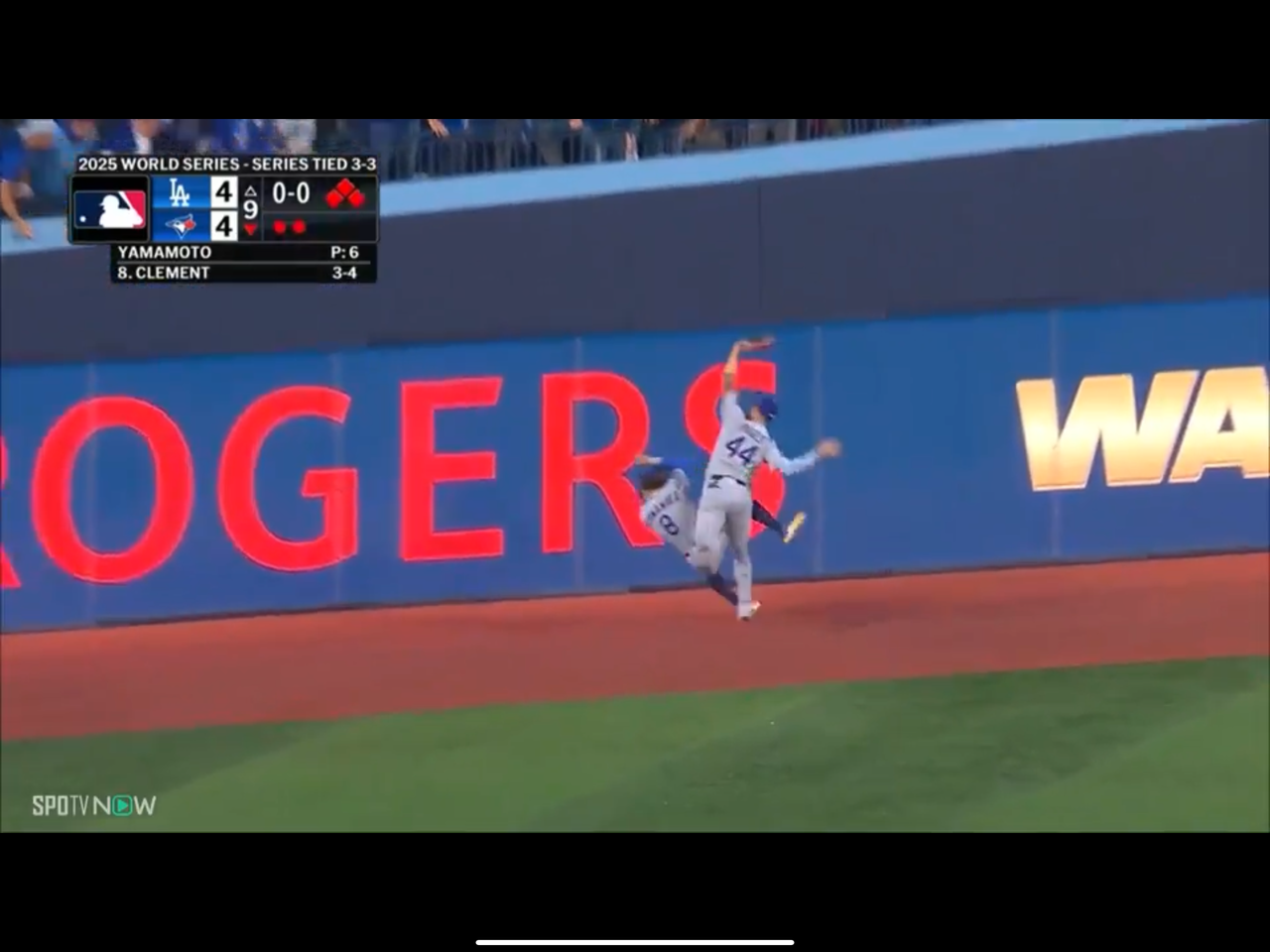 続いて、フェンスを越えそうな大飛球をキケと交錯しながらも、パヘスが好捕。