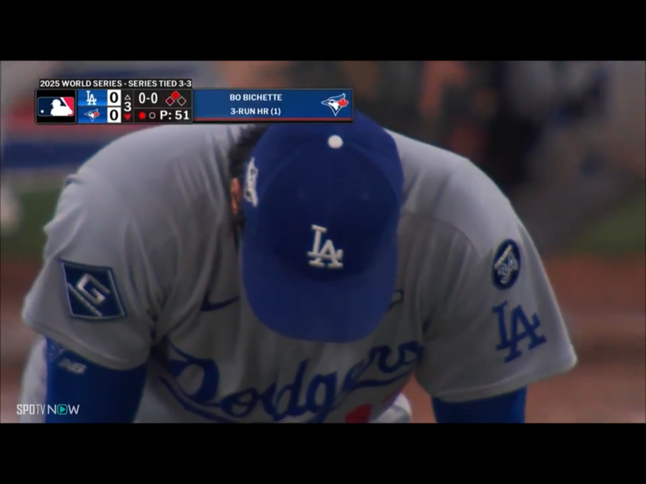 11回裏ワン・アウト1-3塁、最後も際どいプレーをベッツがダブル・プレーで納めた。えびぞる山本由伸、体柔らかい。